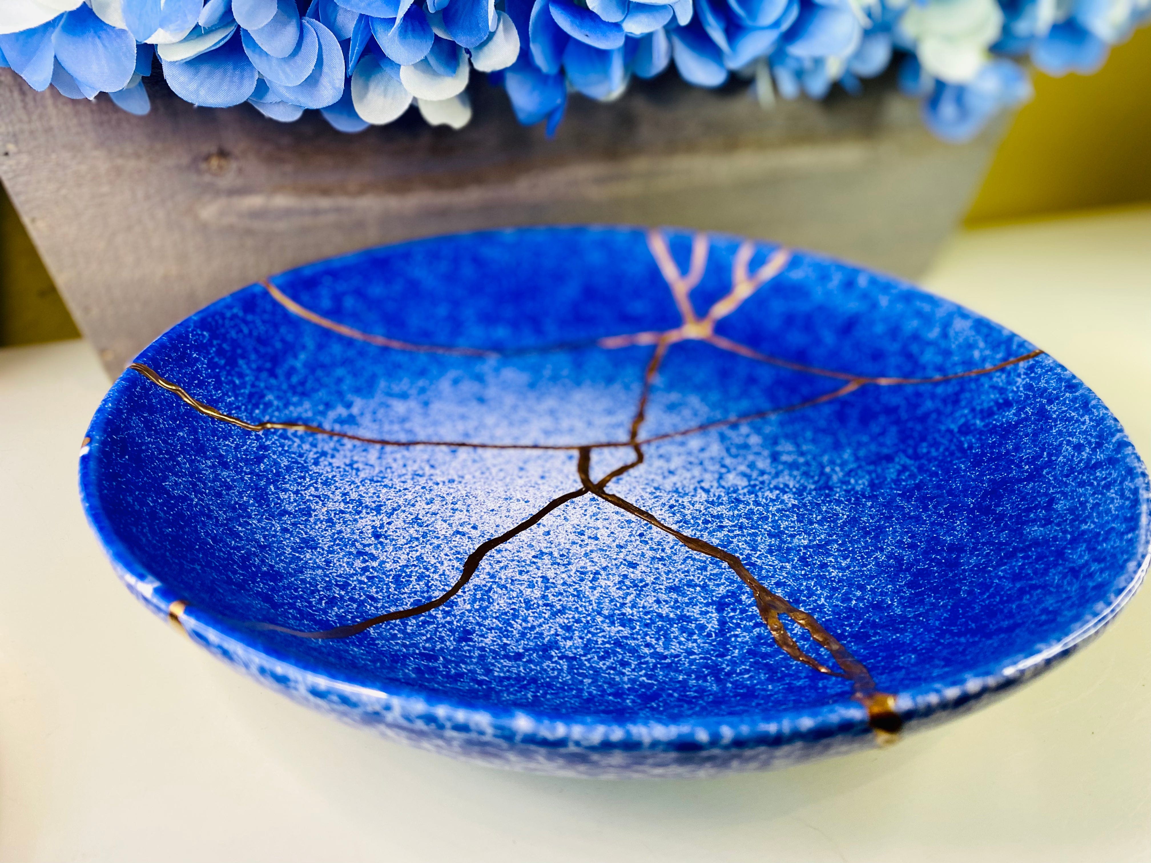 Item: Kintsugi Gifts, Blue Frost Speckled Shallow Bowl, Kintsugi Pottery, Blue Kintsugi Centerpiece Bowl. Japanese Home Decor, Kintsugi Bowls, Minimalist, Home Decor, Kintsugi Blue Frosted Platter